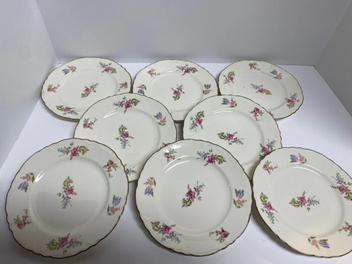 Enhance your dining experience with this exquisite set of 8 Homer Laughlin Priscilla Pattern dinner plates. Featuring a charming floral design and elegant gold trim, these vintage plates are a must-have for any collector. Produced likely around 1949, for the Household Institute. Plate is 7″, pre-owned, good condition, 1 plate has chip as shown in picture, 1 plate has crack on edge as shown in picture.